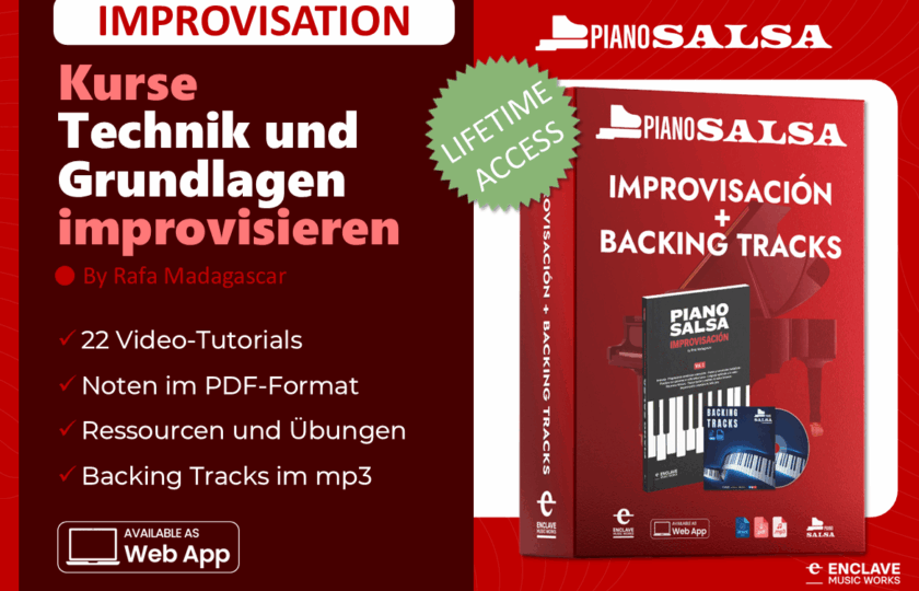 Der Kurs ANFÄNGER STUFE ist der erste in der Sammlung der Trilogie der 3 Stufen der PIANO SALSA Methode. Dieser Kurs, wie auch die anderen Stufen, ist in 4 große Inhaltsblöcke gegliedert: THEORIE, PRAXIS, MONTUNOS und REPERTOIRE. In jedem dieser Blöcke finden Sie exklusives Material zum Lernen und Üben. Fast alle Videos werden mit einer herunterladbaren PDF-Datei geliefert, in der Sie Partituren oder Zusammenfassungen des Inhalts der einzelnen Lektionen finden.
