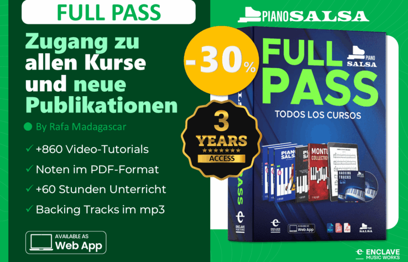 Der Kurs MITTELSTUFE ist der zweite in der Sammlung der Trilogie der 3 Stufen der PIANO SALSA Methode. Dieser Kurs, wie auch die anderen Stufen, ist in 4 großen Inhaltsblöcken organisiert: THEORIE, PRAXIS, MONTUNOS und REPERTORIO. In jedem dieser Blöcke finden Sie exklusives Material zum Lernen und Üben. Zu den meisten Videos gibt es PDF-Dateien mit Partituren oder Zusammenfassungen des Inhalts der jeweiligen Lektion.